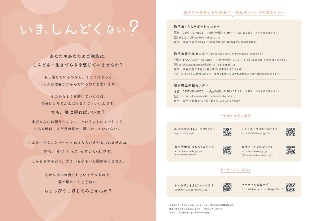 市内の公立中学校を卒業する中学3年生に向けて、取手市社会福祉協議会に設置されている「取手市くらしサポートセンター」さんから、これから先、困ったときやしんどいときに頼ってもらいたい場所ををお知らせする情報を載せたアーティストカード。