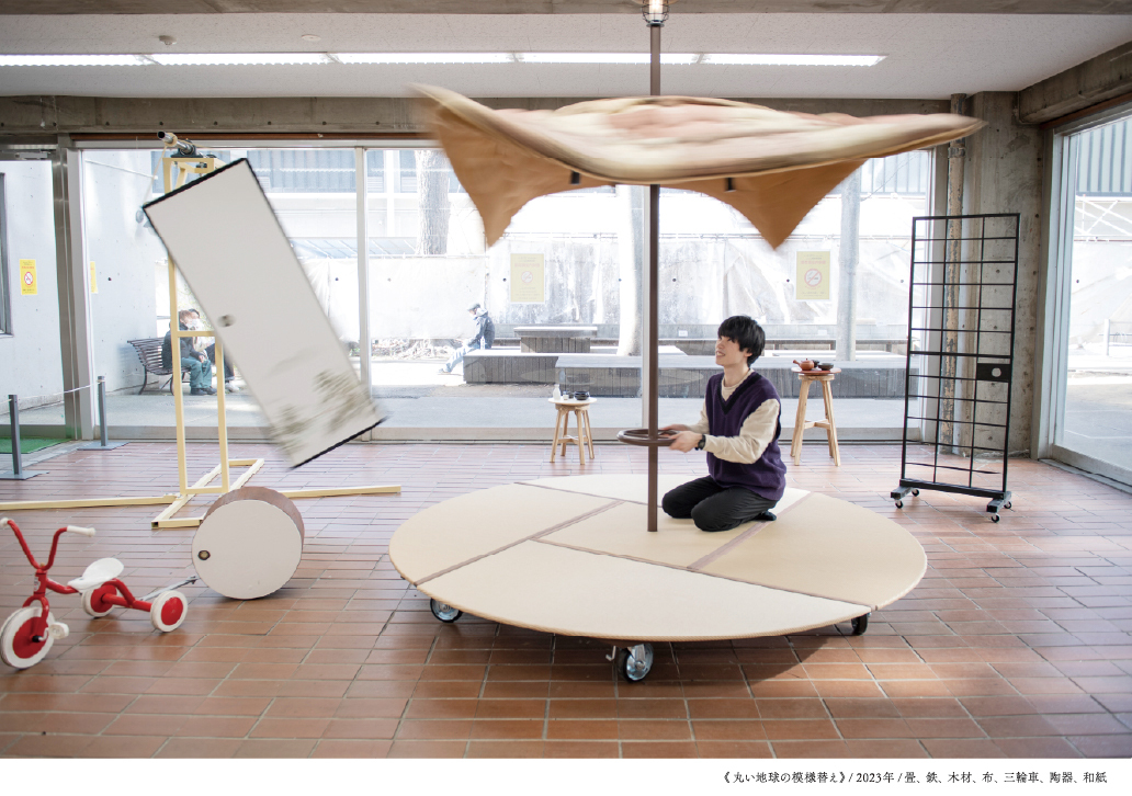 浅野ひかり 《まるい地球の模様替え》|2023年|畳、鉄、木材、布、三輪車、陶器、和紙