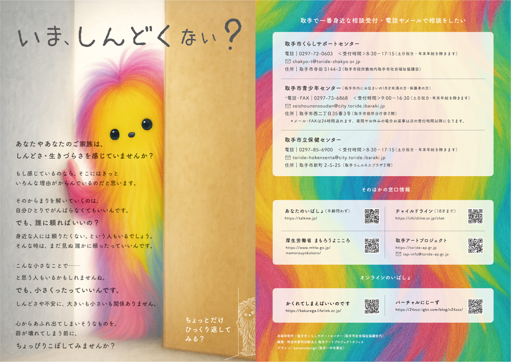 市内の公立中学校を卒業する中学3年生に向けて、取手市社会福祉協議会に設置されている「取手市くらしサポートセンター」さんから、これから先、困ったときやしんどいときに頼ってもらいたい場所ををお知らせする情報を載せたアーティストカード。
